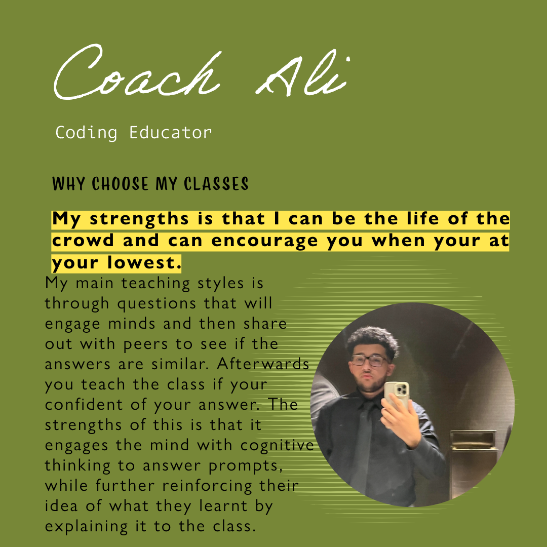 My strengths is that I can be the life of the crowd and can encourage you when your at your lowest. My main teaching styles is through questions that will engage minds and then share out with peers to see if the answers are similar. Afterwards you teach the class if your confident of your answer. The strengths of this is that it engages the mind with cognitive thinking to answer prompts, while further reinforcing their idea of what they learnt by explaining it to the class.